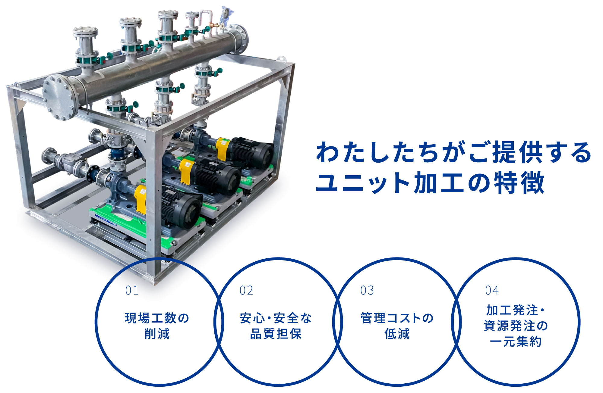 現場の作業工数を削減すべく、工場内で配管を組立てし、ユニット化。グループ会社の持つ資材調達力とエンジニアリング技術を組み合わせ、厳しい工程や人手不足の解決につなげます。